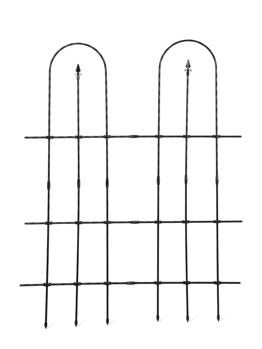 With its classic Roman arches and spear-shaped finials, this charming border panel provides an elegant garden backdrop on its own, or as a trellis, lightly twined with smaller annual vines. Sturdy steel-core design stands straighter and taller than comparable fencing, and polyethylene coating is gentle on plant stems. Setting up and expanding your border by adding more segments is easy too: each double-arch panel connects to the next with the included connector clips.
