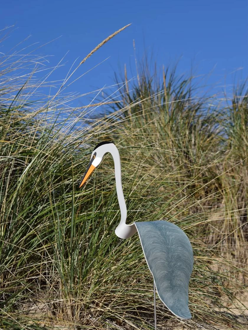 This Great Blue Heron dances on the slightest breeze. A special hinge allows it to swivel and dip atop a 35″ galvanized stake. It is 24″ long x 6.5″ wide. Made from UV-resistant PVC, entirely hand painted and hand formed, it is durable in day-to-day weather. Simply lift off the stake to take in during severe weather or extreme temperatures. Made in the USA.